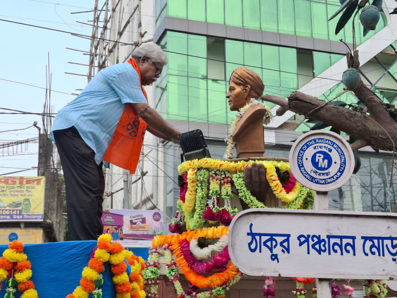- ঠাকুর পঞ্চানন বর্মার প্রতিকৃতিতে মাল্যদান করছেন রায়গঞ্জের পৌরপতি সহ বিশিষ্ট জনেরা।