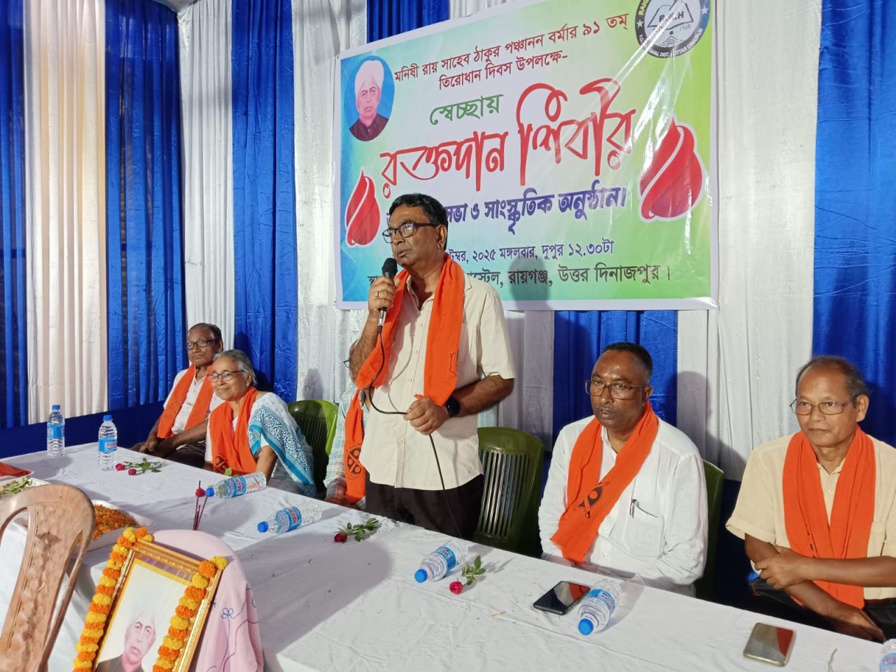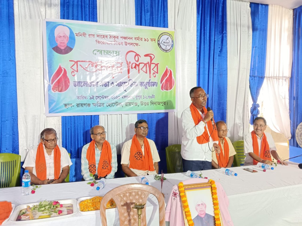 ২৩ শে ভাদ্র , ১৪৩২ , মঙ্গলবার সকাল ৯ টায় , রায় সাহেব ঠাকুর পঞ্চানন বর্মার তিরোধান দিবস উপলক্ষ্যে রায়গঞ্জ পৌরসভার উদ্যোগে এবং ঠাকুর পঞ্চানন বর্মা সেবা সমিতি ও রায়গঞ্জ ক্ষত্রিয় হোস্টেলের যৌথ সহযোগিতার মধ্য দিয়ে রায়গঞ্জ পঞ্চানন বর্মা মোড়ে রায়গঞ্জ পৌরসভা কর্তৃক প্রতিষ্ঠিত ঠাকুর পঞ্চানন বর্মার মূর্তির পাদদেশে আমরা সকলে সমবেত হয়েছিলাম শ্রদ্ধাপূর্ণ অনুষ্ঠানে। রায় সাহেব ঠাকুর পঞ্চানন বর্মার মূর্তিতে শ্রদ্ধা নিবেদন এবং শ্রদ্ধাপূর্ণ অনুষ্ঠানের মাধ্যমে দিনটি যথাযথ মর্যাদার সঙ্গে পালন করা হল।তার পরবর্তীতে দুপুর ১২ টা ৩০ মিনিটে রায় সাহেব ঠাকুর পঞ্চানন বর্মার তিরোধান দিবস উপলক্ষ্যে রায়গঞ্জে পুরাতন উকিলপাড়ায় অবস্থিত শতবর্ষ প্রাচীন ক্ষত্রিয় হোস্টেলে শ্রদ্ধাপূর্ণ সাংস্কৃতিক অনুষ্ঠান এবং ঠাকুর পঞ্চানন বর্মার প্রতিকৃতিতে শ্রদ্ধাজ্ঞাপন , শ্রদ্ধাপূর্ণ বক্তব্য এবং রক্তদান শিবিরের মধ্য দিয়ে দিনটি যথাযোগ্য মর্যাদার সাথে পালন করা হয়।তার কিছু মুহূর্ত তুলে ধরা হল।